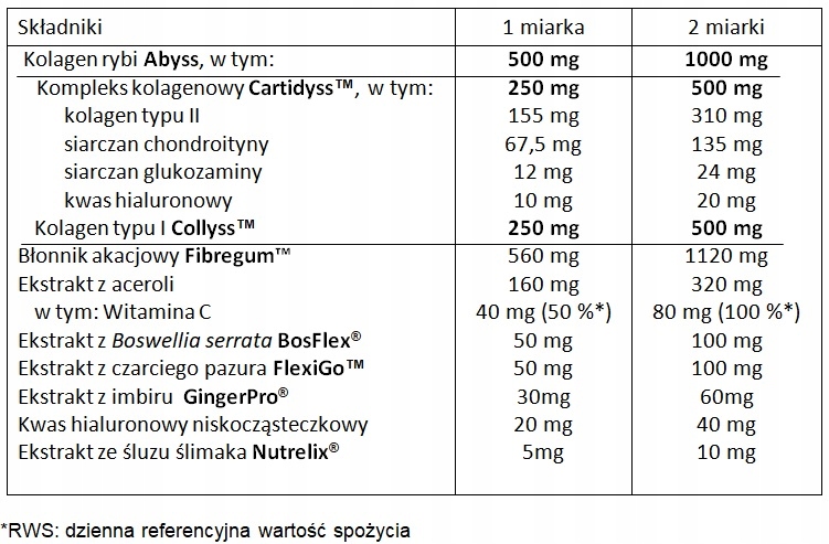 Składniki: Cartidyss™ (kompleks kolagenowy z chrząstki rybiej: zhydrolizowany kolagen typu II, siarczan chondroityny, siarczan glukozaminy oraz kwas hialuronowy), Collyss™ (zhydrolizowany kolagen rybi typu I), błonnik akacjowy Fibregum™, ekstrakt z Boswellia serrata (70% kwasów bosweliowych) BosFlex®, ekstrakt z czarciego pazura (DER 4:1) FlexiGo™, ekstrakt z imbiru lekarskiego (5% gingeroli) GingerPro®, ekstrakt z aceroli (25% witaminy C), kwas hialuronowy niskocząsteczkowy, ekstrakt ze śluzu ślimaka Nutrelix®.