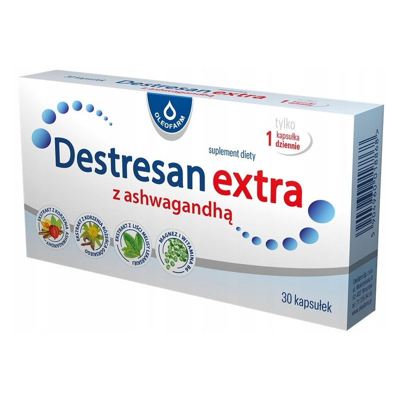 Suplement diety Destresan extra z ashwagandhą to produkt zawierający kompozycje ekstraktów roślinnych: z liści melisy lekarskiej, z korzenia rożeńca górskiego, z korzenia ashwagandhy oraz magnez i witaminę B6.
