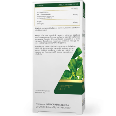 Bacopa (Bacopa monnieri) wspomaga utrzymanie prawidłowych procesów uczenia się. Wspiera właściwe mikrokrążenie krwi przyczyniając się do odpowiedniej pracy komórek mózgowych. Pomaga zachować prawidłowe funkcje poznawcze (pamięć i koncentrację) szczególnie u osób w podeszłym wieku. Dodatkowo wspiera właściwą reakcję na stres oraz sprzyja spokojnemu zasypianiu.