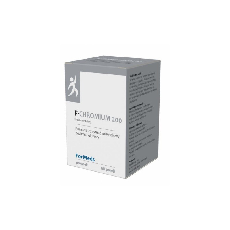 Suplement diety F-CHROMIUM 200 zawiera chrom (pikolinian) oraz inulinę z korzenia cykorii w formie proszku.