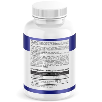 Pikolinian cynku Insport Nutrition to suplement diety w formie kapsułek roślinnych, zawierający łatwo przyswajalną formę cynku. Każda kapsułka dostarcza 15 mg tego ważnego mikroelementu, co odpowiada 150% referencyjnych wartości spożycia. Cynk wspiera liczne procesy metaboliczne w organizmie, od prawidłowej syntezy DNA po regulację metabolizmu węglowodanów i równowagi kwasowo-zasadowej. Jako składnik istotny dla płodności, funkcji poznawczych oraz wielu reakcji enzymatycznych, stanowi wartościowe uzupełnienie codziennej diety. Regularne stosowanie może pomóc w utrzymaniu prawidłowych funkcji organizmu, zwłaszcza u osób narażonych na zwiększone zapotrzebowanie na cynk.