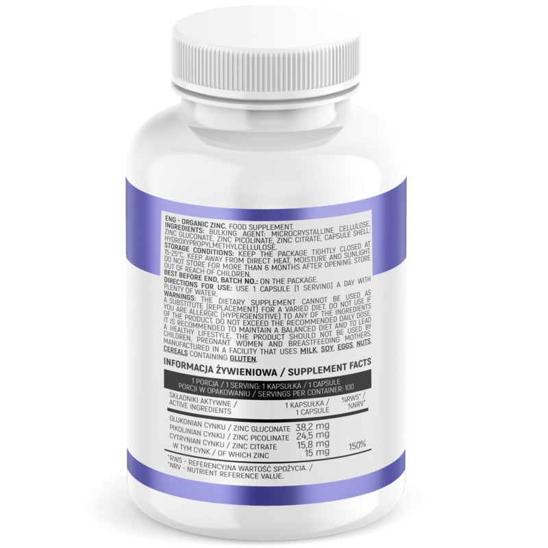 Składniki: Substancja wypełniająca: celuloza mikrokrystaliczna, glukonian cynku, pikolinian cynku, cytrynian cynku, otoczka kapsułki: hydroksypropylometyloceluloza.