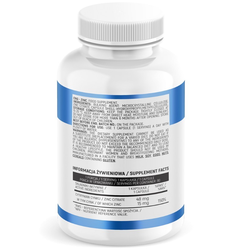 Składniki: Substancja wypełniająca: celuloza mikrokrystaliczna, cytrynian cynku, otoczka kapsułki: hydroksypropylometyloceluloza.