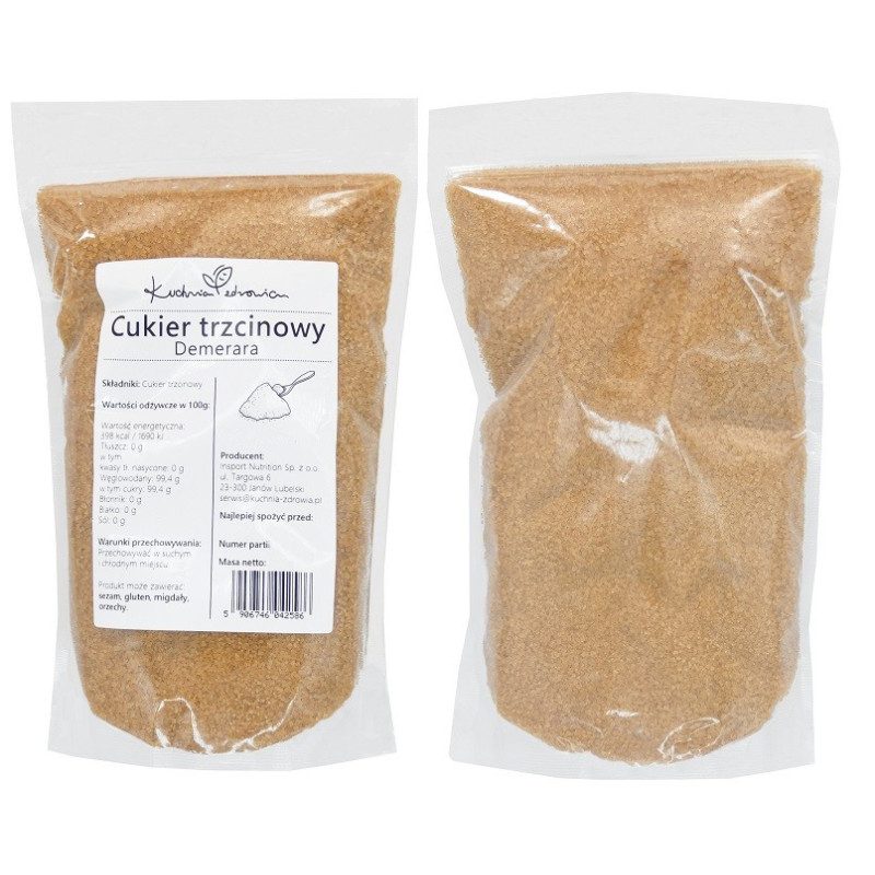 Podobnie jak biały cukier, cukier trzcinowy dostarcza około 4 kalorie na gram. Jednak, w przeciwieństwie do cukru białego, cukier trzcinowy zawiera niewielkie ilości składników mineralnych, takich jak magnez, potas, wapń i żelazo, dzięki melasie, której nie usuwa się podczas procesu produkcji.