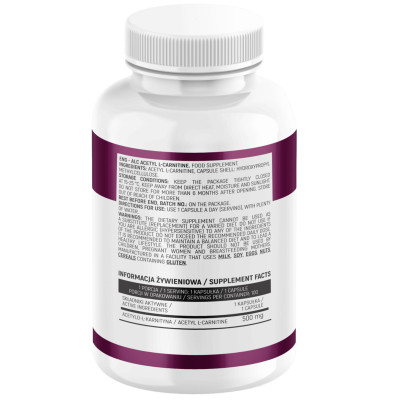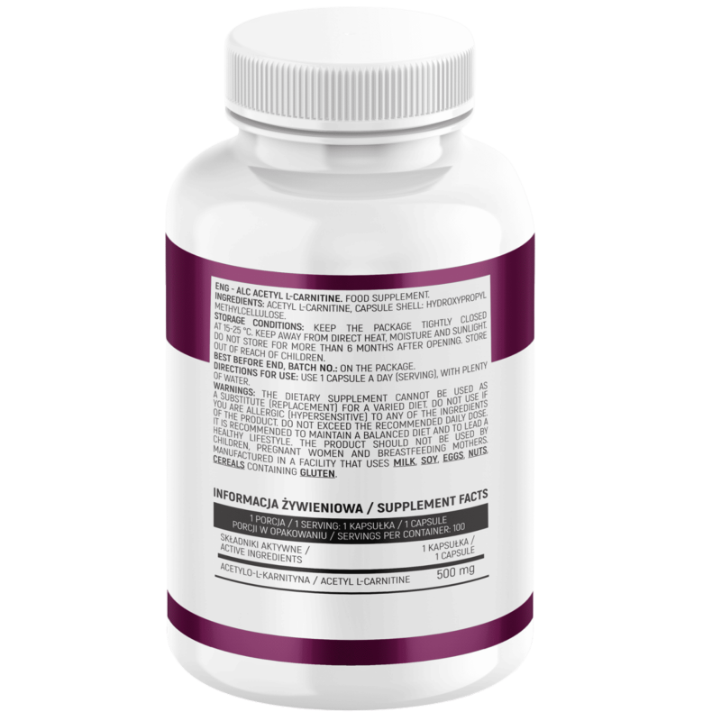 Składniki: Acetylo-L-karnityna, otoczka kapsułki: hydroksypropylometyloceluloza.