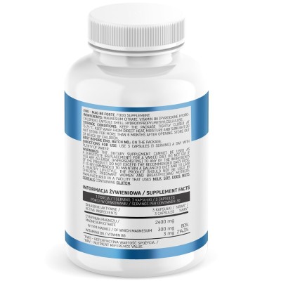 Mag B6 FORTE to suplement diety w kapsułkach stworzony przez Insport Nutrition, który łączy w sobie dobrze przyswajalny cytrynian magnezu i witaminę B6. Składniki te wspierają prawidłowy metabolizm energetyczny, mięśniowy i nerwowy, a także biorą udział w procesach krwiotwórczych. Regularne stosowanie preparatu może być szczególnie korzystne dla osób narażonych na stres, wysiłek fizyczny lub umysłowy. Dzięki wysokiej zawartości składników aktywnych produkt stanowi wygodne uzupełnienie codziennej diety.