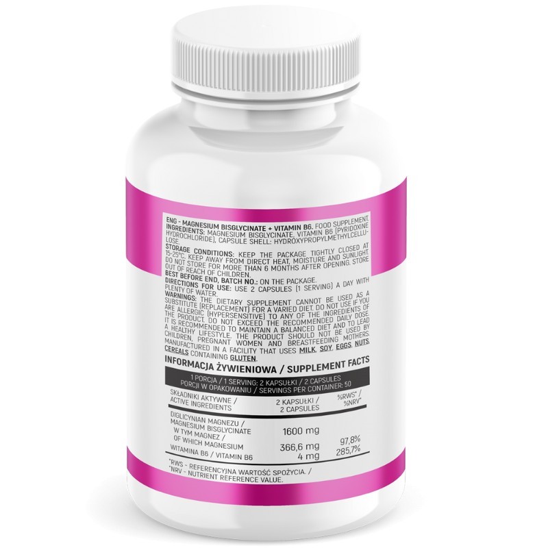 Składniki: Diglicynian magnezu, witamina B6 (chlorowodorek pirydoksyny), otoczka kapsułki: hydroksypropylometyloceluloza.