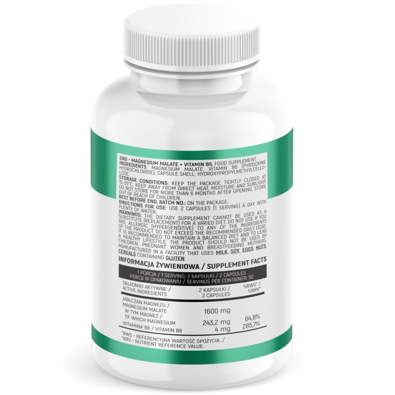Składniki: Jabłczan magnezu, witamina B6 (chlorowodorek pirydoksyny), otoczka kapsułki: hydroksypropylometyloceluloza.