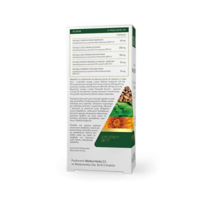 Składniki: (w przeliczeniu na zalecaną porcję do spożycia w ciągu dnia – 2 kapsułki): wyciąg z ziaren Silybum marianum 120 mg (96 mg sylimaryny); wyciąg z liści Cynara scolymus 400 mg (20 mg cynaryny); wyciąg z ziela Taraxacum officinale 380 mg (15,2 mg flawonów); wyciąg z nasion Trigonella foenum – graecum 110 mg (55 mg saponin); wyciąg z korzenia Curcuma longa 70 mg (68,6 mg kurkuminoidów); żelatyna (kapsułka).