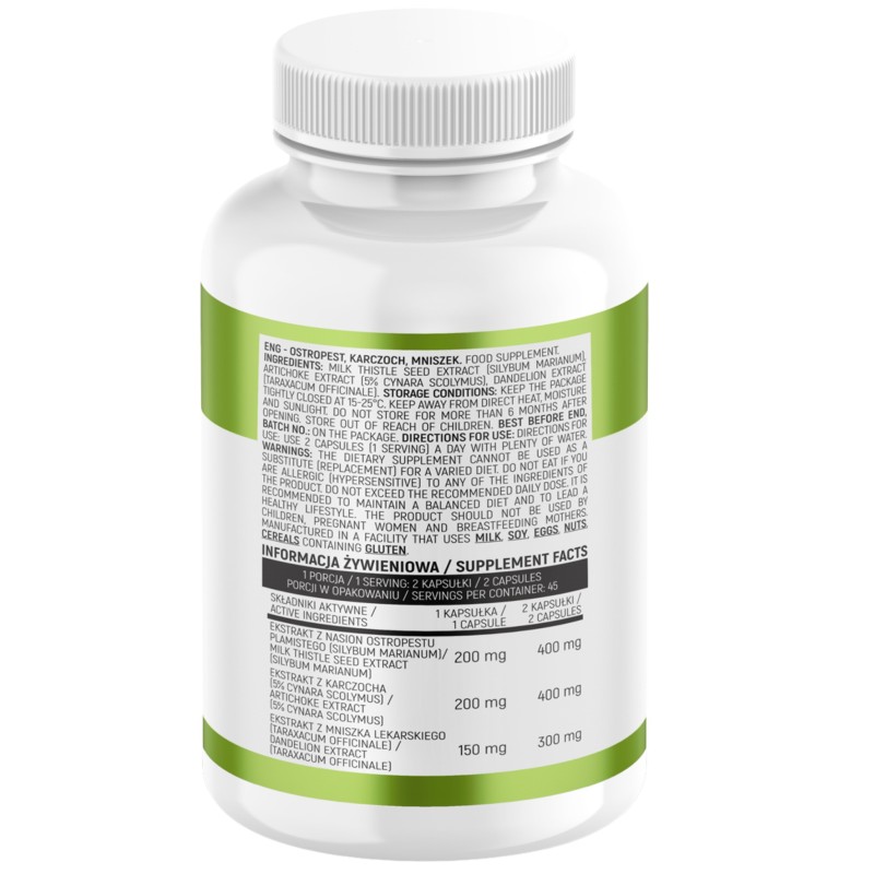 Składniki: Ekstrakt z nasion ostropestu plamistego (Silybum marianum), ekstrakt z karczocha (Cynara scolymus), ekstrakt z mniszka lekarskiego (Taraxacum officinale).
