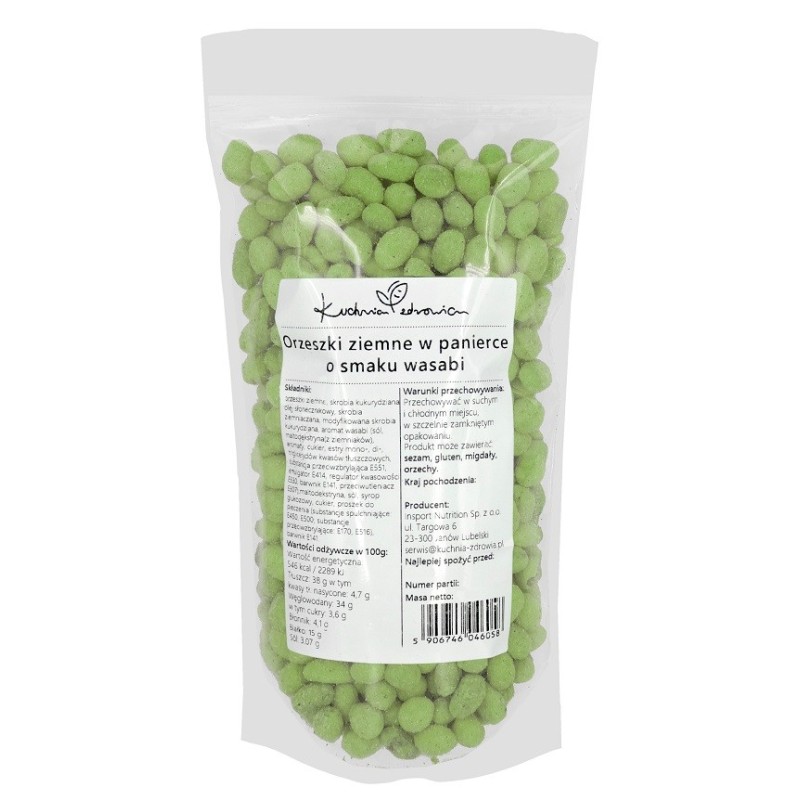 Składniki: orzeszki ziemne, skrobia kukurydziana, olej słonecznikowy, skrobia ziemniaczana, modyfikowana skrobia kukurydziana, aromat wasabi (sól, maltodekstryna(z ziemniaków), aromaty, cukier, estry mono-, di-, triglicerydów kwasów tłuszczowych, substancja przeciwzbrylająca E551, emulgator E414, regulator kwasowości E330, barwnik E141, przeciwutleniacz E307),maltodekstryna, sól, syrop glukozowy, cukier, proszek do pieczenia (substancje spulchniające: E450, E500; substancje przeciwzbrylające: E170, E516), barwnik E141.
