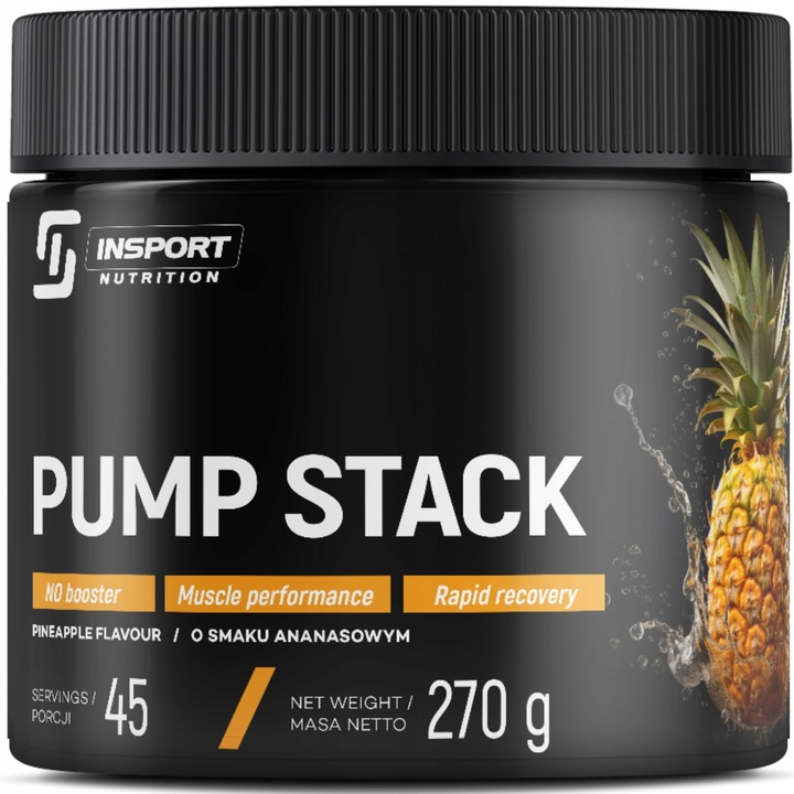 Pump Stack 270g od Insport Nutrition to suplement diety w formie proszku, który łączy alfaketoglutaran argininy, jabłczan cytruliny, taurynę i witaminę B6. Takie połączenie składników sprawia, że produkt jest chętnie wybierany przez osoby trenujące różne dyscypliny sportowe. Witamina B6 wspiera prawidłowe funkcjonowanie układu nerwowego, metabolizm energetyczny oraz odporność[1]. Dzięki proszkowej formie, suplement jest łatwy w przygotowaniu – wystarczy wymieszać porcję z wodą lub sokiem i wypić przed wysiłkiem. To praktyczne rozwiązanie dla osób, które chcą wzbogacić swoją suplementację o składniki popularne w formułach przedtreningowych.