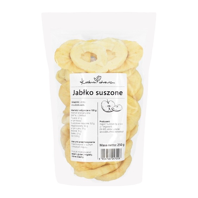 ✅Suszone jabłka Kuchnia Zdrowia to starannie wyselekcjonowane owoce, które poddano suszeniu w kontrolowanych warunkach. Dzięki temu zachowują swój wyjątkowy aromat oraz naturalną słodycz. Świetnie sprawdzą się zarówno w daniach słodkich, jak i wytrawnych.