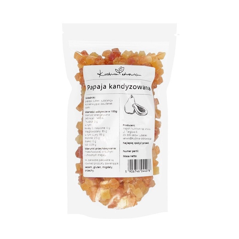 Papaja kandyzowana marki Kuchnia Zdrowia to wysokiej jakości, naturalny przysmak, który łączy w sobie egzotyczny smak świeżej papai z delikatną słodyczą procesu kandyzowania. Produkt ten jest starannie przygotowywany z najlepszych, starannie wyselekcjonowanych owoców papai, aby zapewnić nie tylko doskonały smak, ale także zachować jak najwięcej wartości odżywczych.