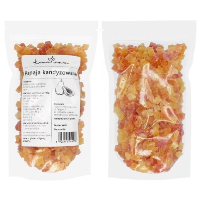 Kandyzowana papaja charakteryzuje się żywym, często pomarańczowym lub żółtym kolorem, który jest dodatkowo wzbogacony przez proces kandyzowania. Jest to idealna przekąska do podjadania w ciągu dnia lub jako dodatek do deserów i płatków śniadaniowych.