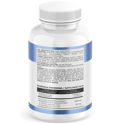 Składniki: Maślan sodu (sól sodowa kwasu masłowego) otoczkowany skrobią preżelowaną, otoczka kapsułki: hydroksypropylometyloceluloza.