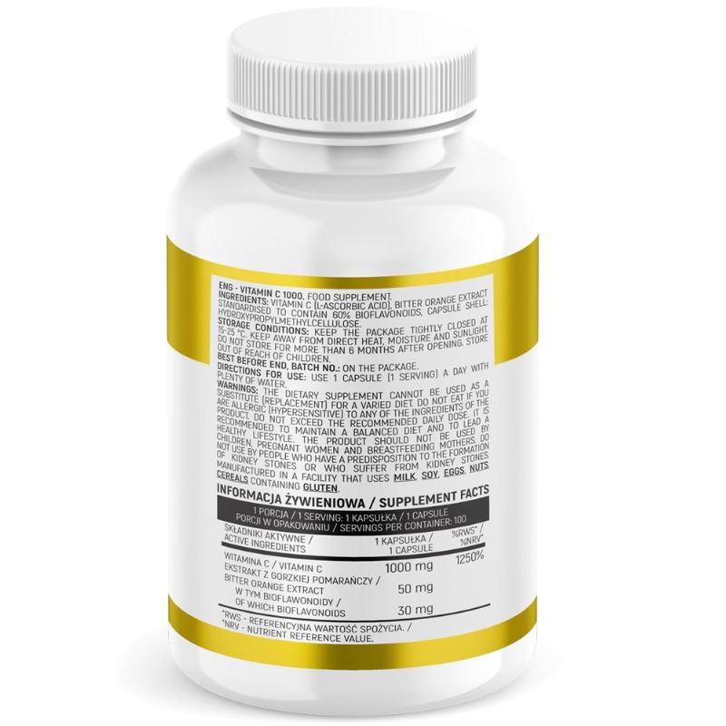 Składniki: Witamina C (kwas L-askorbinowy), ekstrakt z gorzkiej pomarańczy standaryzowany na zawartość 60% bioflawonoidów, otoczka kapsułki: hydroksypropylometyloceluloza.
