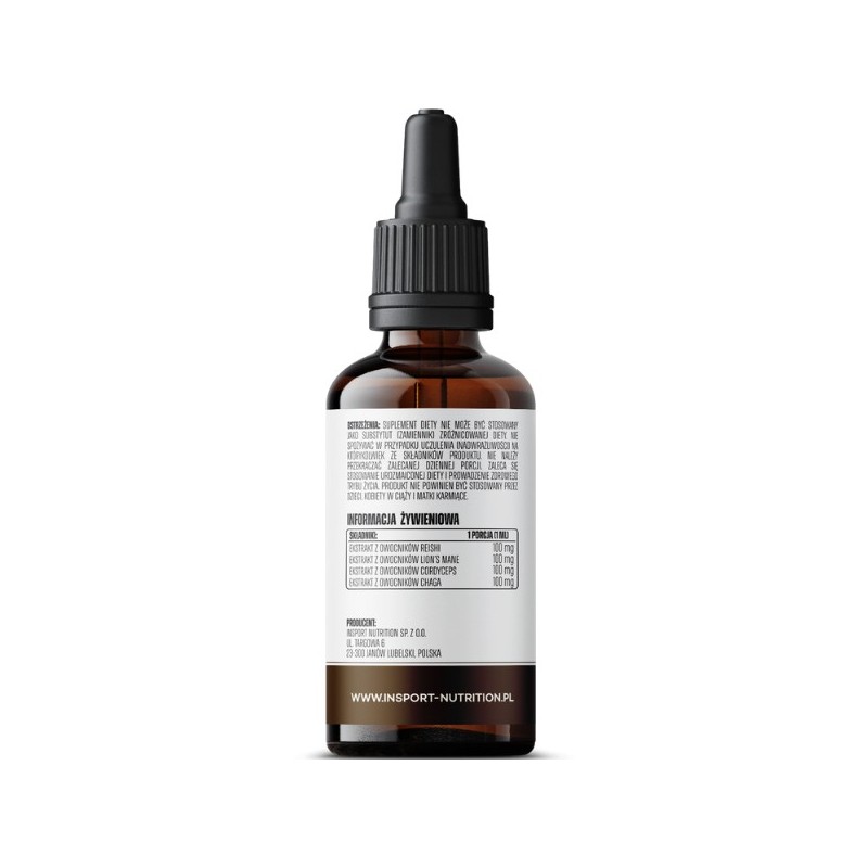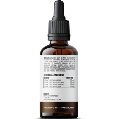 Składniki: Woda, gliceryna, ekstrakt z owocników reishi – lakownica żółtawa (Ganoderma lucidum), ekstrakt z owocników Lion’s Mane – soplówka jeżowata (Hericium erinaceus), ekstrakt z owocników cordyceps – maczużnik bojowy (Cordyceps militaris), ekstrakt z owocników chaga – błyskoporek podkorowy (Inonotus obliquus).