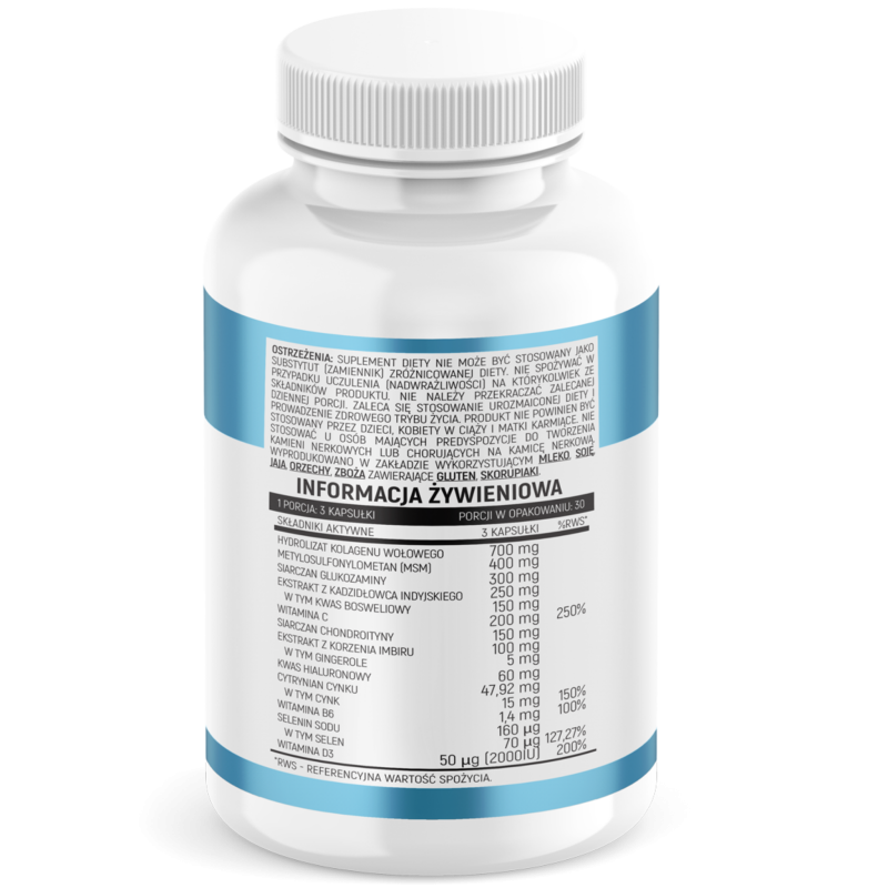 Składniki: Hydrolizat kolagenu wołowego, metylosulfonylometan (MSM), siarczan glukozaminy (ze skorupiaków), ekstrakt z kadzidłowca indyjskiego (Boswellia Serrata) standaryzowany na zawartość 60% kwasu bosweliowego, witamina C (kwas L-askorbinowy), siarczan chondroityny, ekstrakt z korzenia imbiru (Zingiber Officinale Roscoe) standaryzowany na zawartość 5% gingeroli, kwas hialuronowy (hialuronian sodu), witamina d3 (cholekalcyferol z lanoliny), cynk (cytrynian cynku), witamina B6 (chlorowodorek pirydoksyny), selen (selenin sodu), otoczka kapsułki: żelatyna wołowa, woda oczyszczona.
