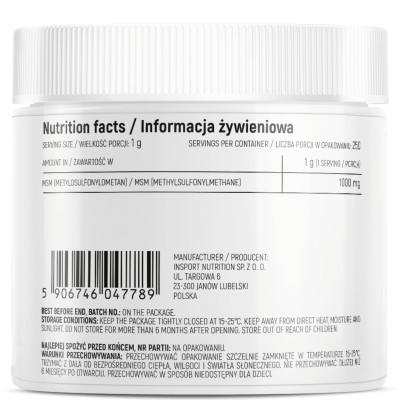 MSM Siarka organiczna 250g od Insport Nutrition to suplement diety w formie proszku, zawierający 100% czystego metylosulfonylometanu. Jest to organiczna forma siarki, szeroko stosowana wśród osób preferujących prosty, przejrzysty skład bez dodatków. Dzięki neutralnemu smakowi MSM można łatwo połączyć z innymi suplementami lub sokiem. Produkt sprawdzi się zarówno u osób aktywnych, jak i tych, które po prostu chcą świadomie uzupełniać dietę o wybrane składniki.