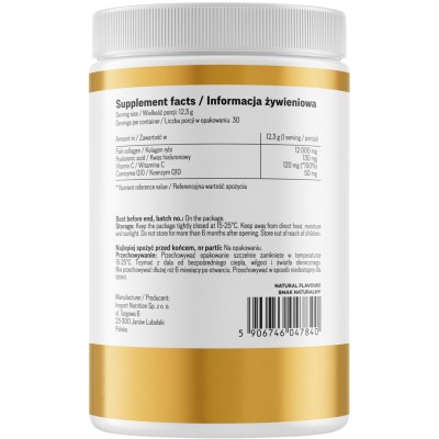 Składniki: Peptydy kolagenu rybiego, kwas hialuronowy (hialuronian sodu), witamina C (kwas L-askorbinowy), koenzym Q10 (ubichinon).